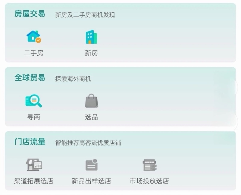 数据罗盘小程序同时还包含三大营销工具类数据,分别是:房屋交易数据、全球贸易数据、门店流量数据。这些数据工具可以帮助各行各业在相关领域实战赋能。