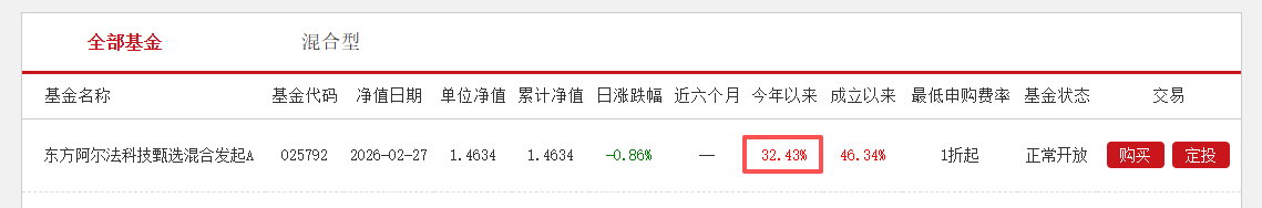 截至2026年2月27日,东方阿尔法科技甄选混合发起A年内净值上涨达到32.43%。东方阿尔法科技甄选混合发起2025年四季度末的重仓股与东方阿尔法精选混合相差较大。