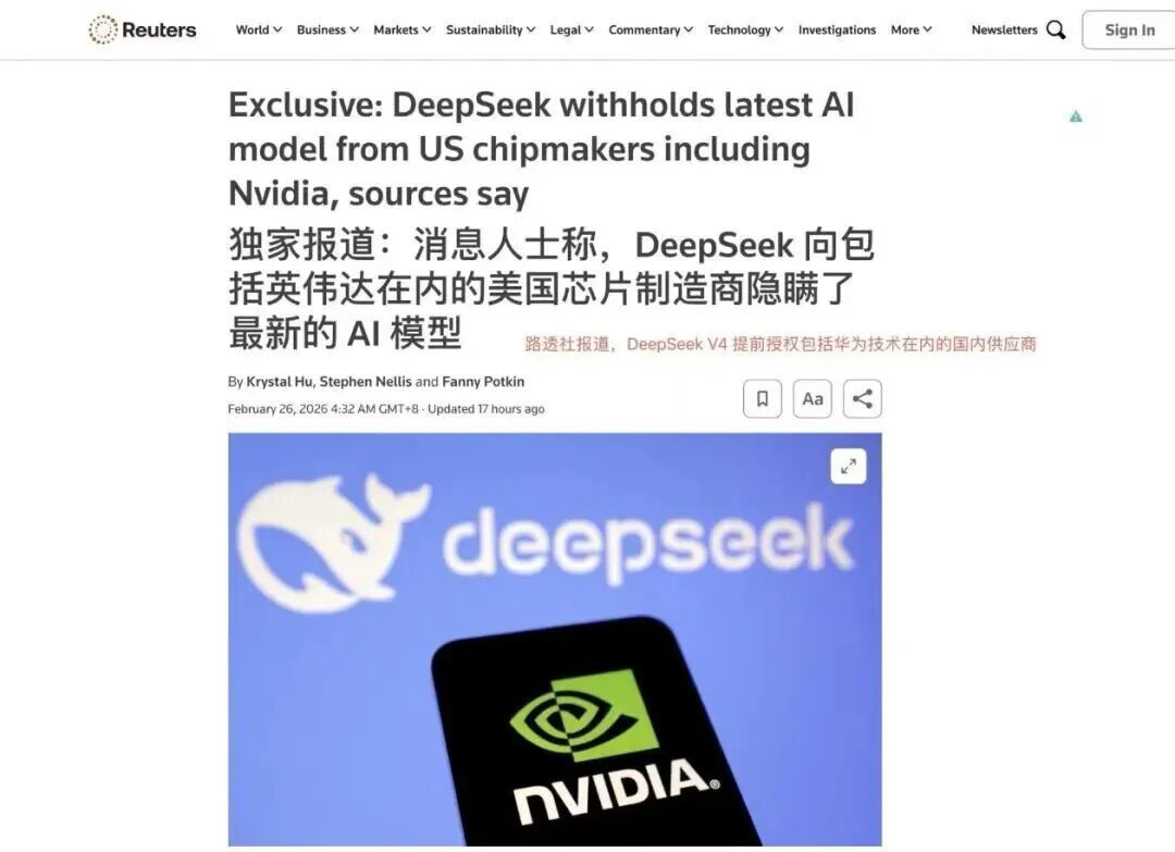 就在几天前,路透社披露了一条炸裂的消息:DeepSeek V4已启动内测,并优先给华为等国产芯片厂商适配。