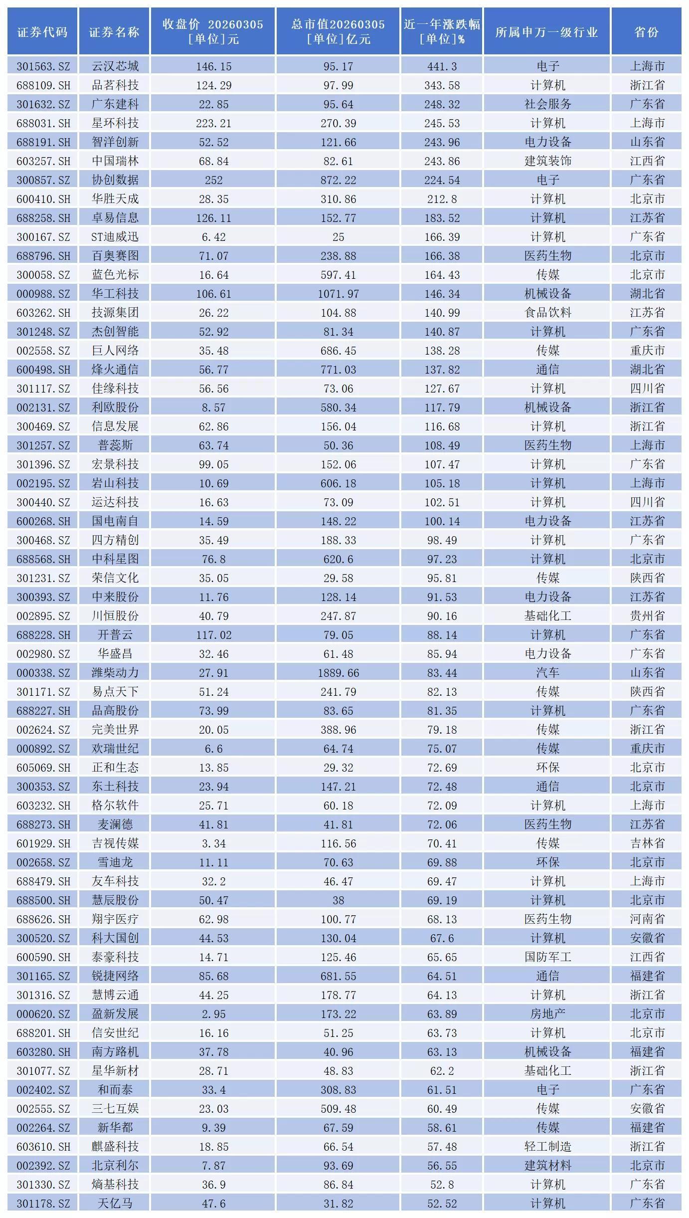 云汉芯城(301563.SZ)、品茗科技(688109.SH)、广东建科(301632.SZ)、星环科技(688031.SH)、智洋创新(688191.SH)、中国瑞林(603257.SH)、协创数据(300857.SZ)、华胜天成(600410.SH)、卓易信息(688258.SH)、ST迪威迅(300167.SZ)、百奥赛图(688796.SH)等25家公司近一年股价累计涨幅已经成功实现**。
