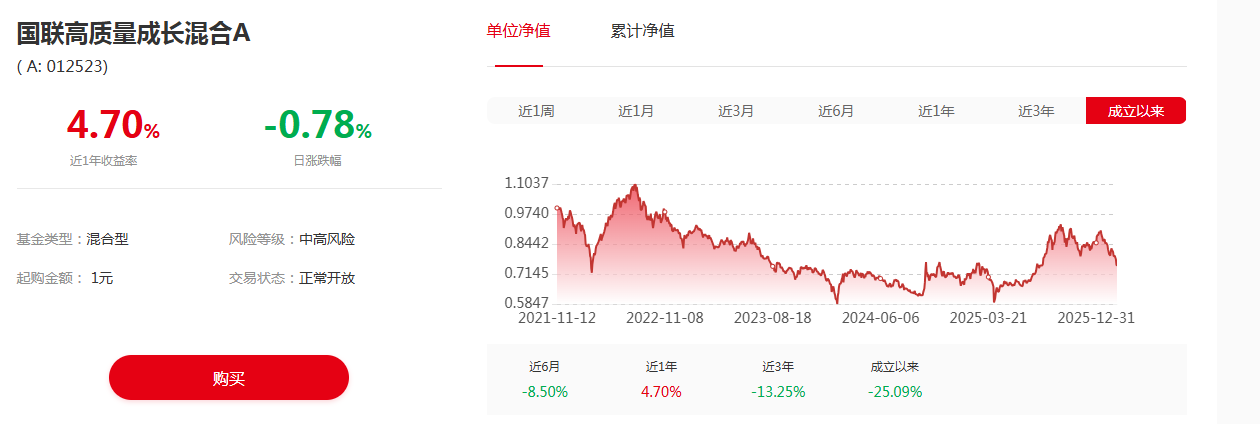 Wind数据显示,截至2026年3月4日,国联高质量成长混合A成立4年多净值累计下跌25.09%,跑输业绩基准超过20个百分点;过去1年净值上涨4.7%,同类排名4097/4478;2026年以来净值下跌11.8%,跑输业绩基准超过10个百分点。