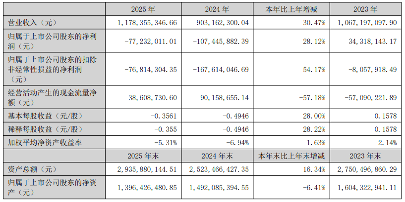 3月6日,爱克股份(300889.SZ)发布2025年年度报告,该公司营业收入为11.78亿元,同比增长30.47%。归属于上市公司股东的净亏损为7723.2万元,同比收窄28.12%。归属于上市公司股东的扣除非经常性损益的净亏损为7681.43万元,同比收窄54.17%。基本每股亏损为0.3561元。