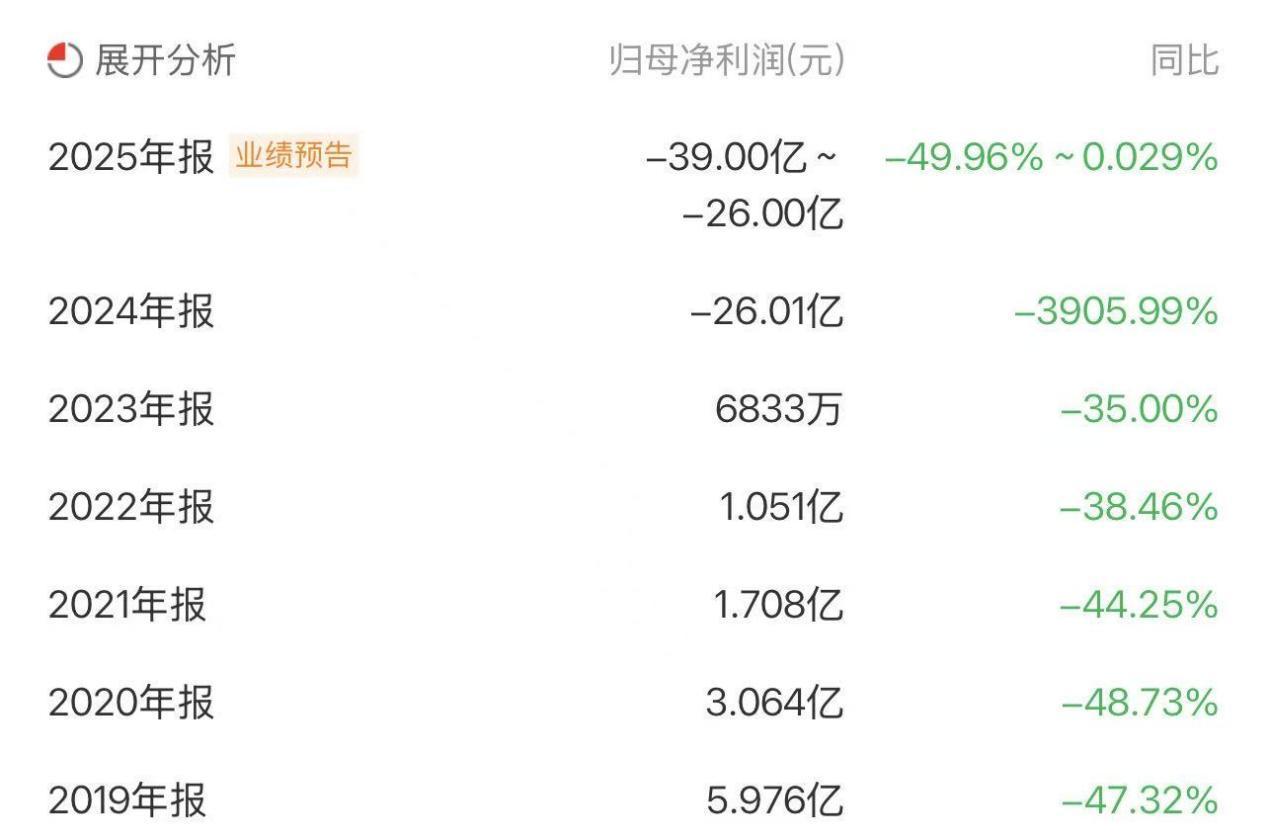 根据福星股份的财务数据,2024年公司净利润亏损26.01亿元;2025年亏损态势持续扩大,全年净利润亏损预计为39亿元至26亿元,面临极高的财务类退市风险。在此之前,福星股份净利润已连续5年下滑,从2019年的5.98亿元下降至2023年的0.68亿元。