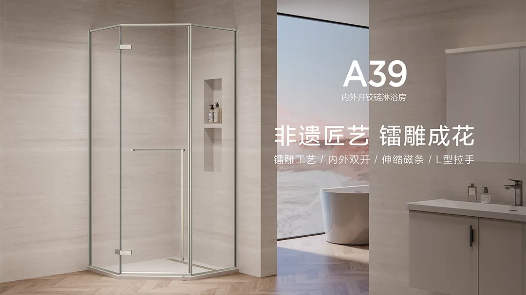 以九牧A62S雅典娜系列淋浴房为例,针对日常使用中的真实痛点就给出了系统性解决方案。它搭载的零重力缓冲技术,解决了传统推拉门“笨重”的难题,轻推即动、缓闭无声,让老人和孩子也能轻松驾驭;针对用户最头疼的清洁问题,玻璃经过易洁处理,水珠滑落不挂垢,抗污能力大幅提升;安全层面同样没有妥协,3C认证的钢化玻璃加贴优质防爆膜,为每一次沐浴提供了坚实的保障。又比如防水上,九牧另一款A39织影淋浴房,采用伸缩式金属磁条和精密铰链结构,再加上三片式下挡水设计,实现360°立体防水,让每一滴水花都无处可逃。