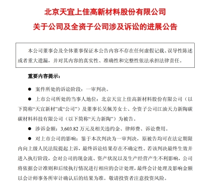 根据公告,天力新陶被判向原告邦银金融租赁股份有限公司(以下简称“邦银金融”)支付租金及留购价款3603.82万元。被告天宜新材、董事长吴佩芳对判决确定的债务承担连带清偿责任。