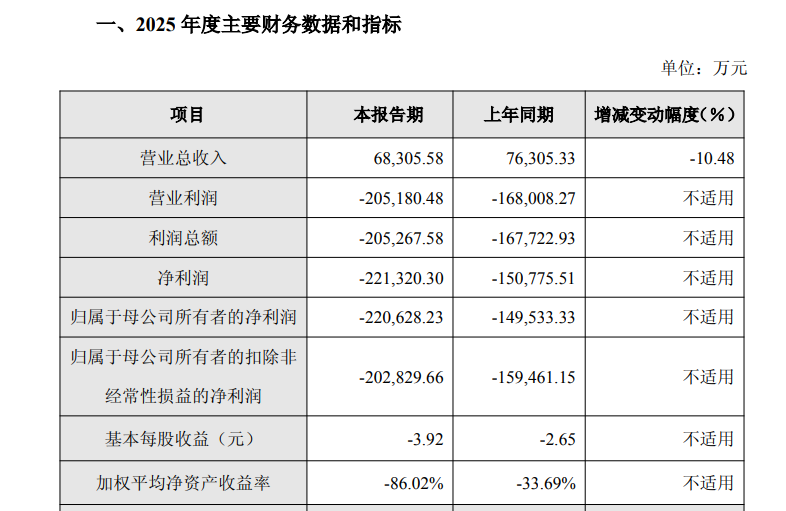 根据此前天宜新材公布的业绩快报,公司预计2025年度实现营业总收入6.83亿元,同比下降10.48%;归母净利润约亏损22.06亿元。