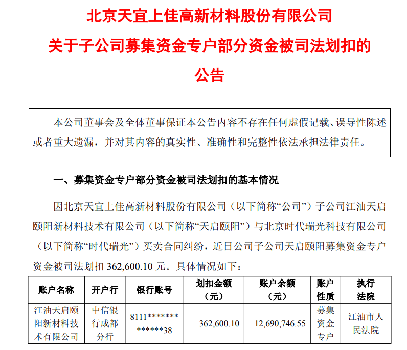 值得关注的是,公告前日,天宜新材已发布关于子公司募集资金专户部分资金被司法划扣的公告。