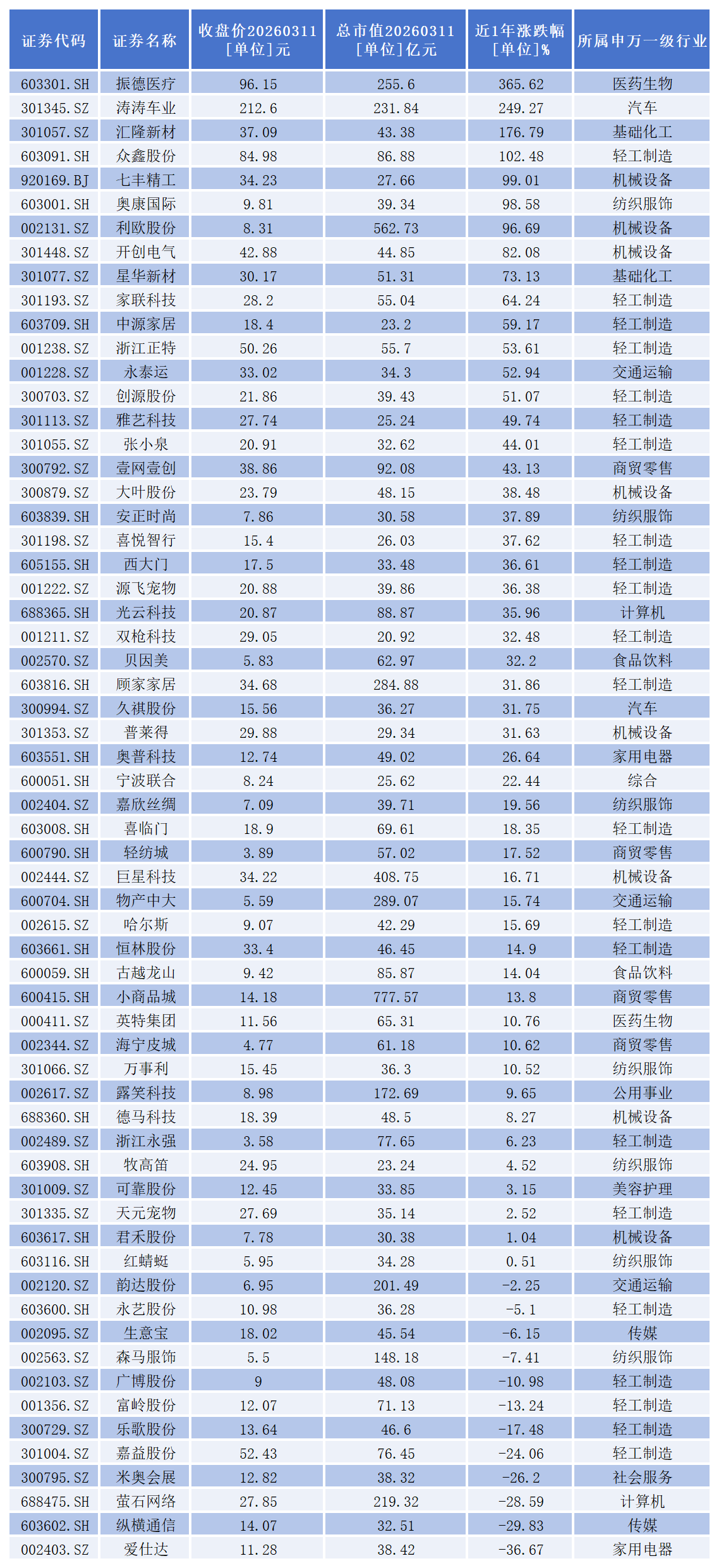 从二级市场表现看,近一年来,振德医疗(603301.SH)、涛涛车业(301345.SZ)、汇隆新材(301057.SZ)、众鑫股份(603091.SH)4家公司股价累计涨幅已超100%。