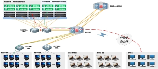 我们梳理了教学实训、科研办公、专业考试、远程实验四大核心场景,明确不同场景的资源需求差异——教学需稳定的标准化环境,科研需高性能计算支撑,学生课后的漫游访问,考试需稳定、安全的系统。因此,我们放弃了针对性的零散方案,决定打造统一资源池,实现“一朵云支撑全场景”。