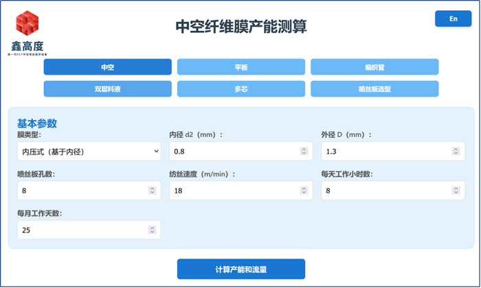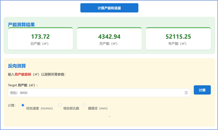 用户输入中空纤维膜的内径、外径、孔数,或平板膜的宽度、涂覆厚度,结合纺丝速度、班时与工作日等要素,系统可自动计算日产能、月产能与年产能。这一过程替代了传统的手动逐项估算,有助于减少计算环节的误差累积。