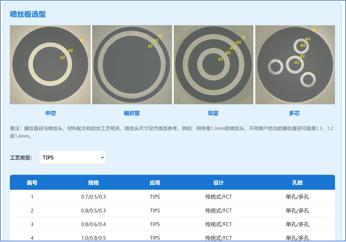 喷丝头选型阶段:面对不同膜工艺,研发人员可通过内置规格库,对比不同喷丝头类型的技术参数,为方案选型或方向预研提供参考。