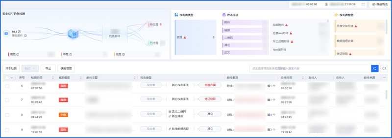 GPT钓鱼检测大模型对每一封邮件进行深度扫描,逐一排查并解析发件人、链接、附件及内容意图。即使邮件伪装得再逼真,也能从细微的异常行为中识别出钓鱼特征,实现精准研判,检出率高达99%以上。