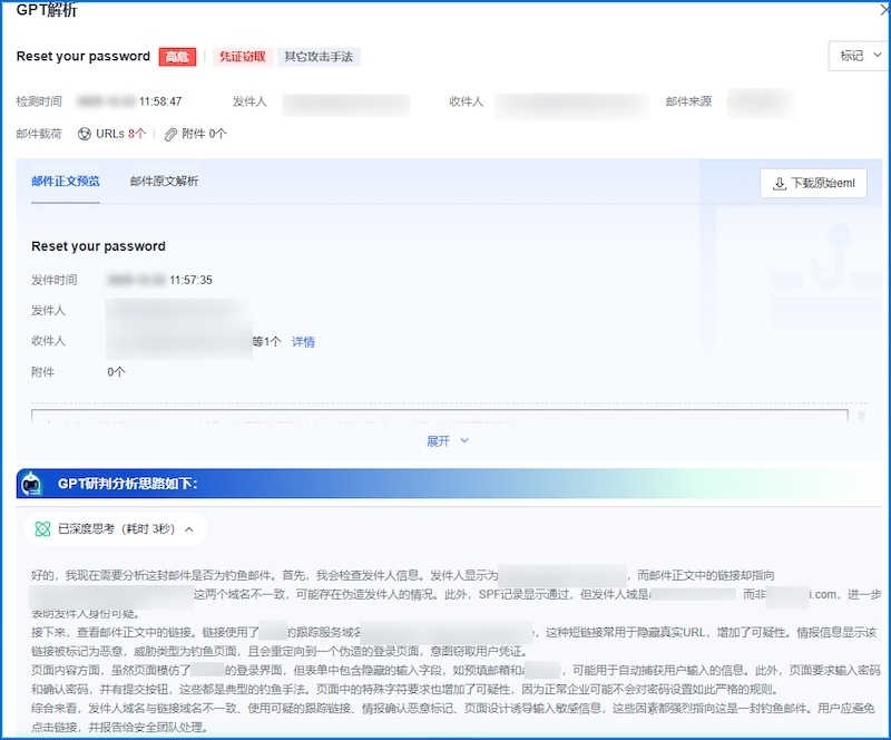 GPT钓鱼检测大模型智能解析“密码重置”邮件,判定其为“钓鱼邮件”