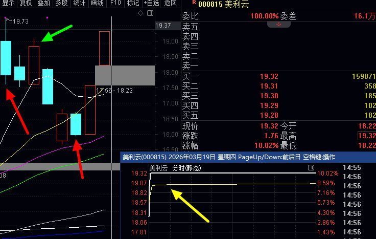 计算机板块的小美,美利云,恭喜17号第2个红色箭头尾盘入场的家人们连续吃2个涨停20%,而且分时黄色线没有跌破《截图黄色线指的那条就是》也是多空分界线,前2天文章分析过,只要20日线不跌破代表主力还在,而且说上面有缺口16.96要补,结果次日涨停反包补掉了,然后今天和我们之前反复3次买过的002470金正大一样都是高开继续直线涨停,区别是他这次涨停很强,没有打开,而且大盘今天大跌他都没有放量砸盘