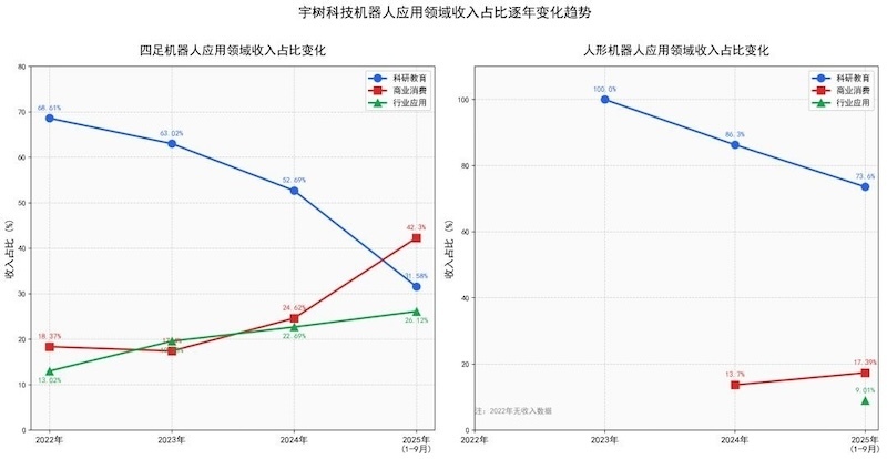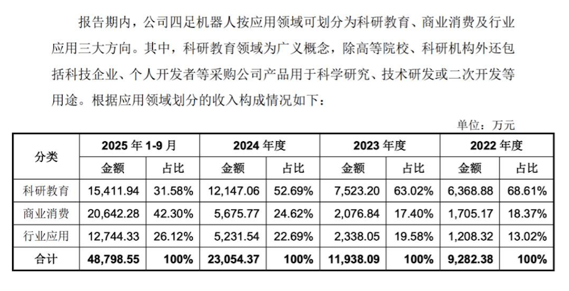 宇树科技“关于宇树科技股份有限公司首次公开发行股票并在科创板上市预先审阅申请文件的问询函的回复”显示,以四足机器人为例,其中科研教育的收入占比从2022年的68.61%,降低到2025年1—9月的31.58%。到2025年1—9月,商业消费、行业应用收入占比分别提升到42.30%、26.12%,商业消费已超过科研教育,成为公司四足机器人销售占比最大的应用领域。