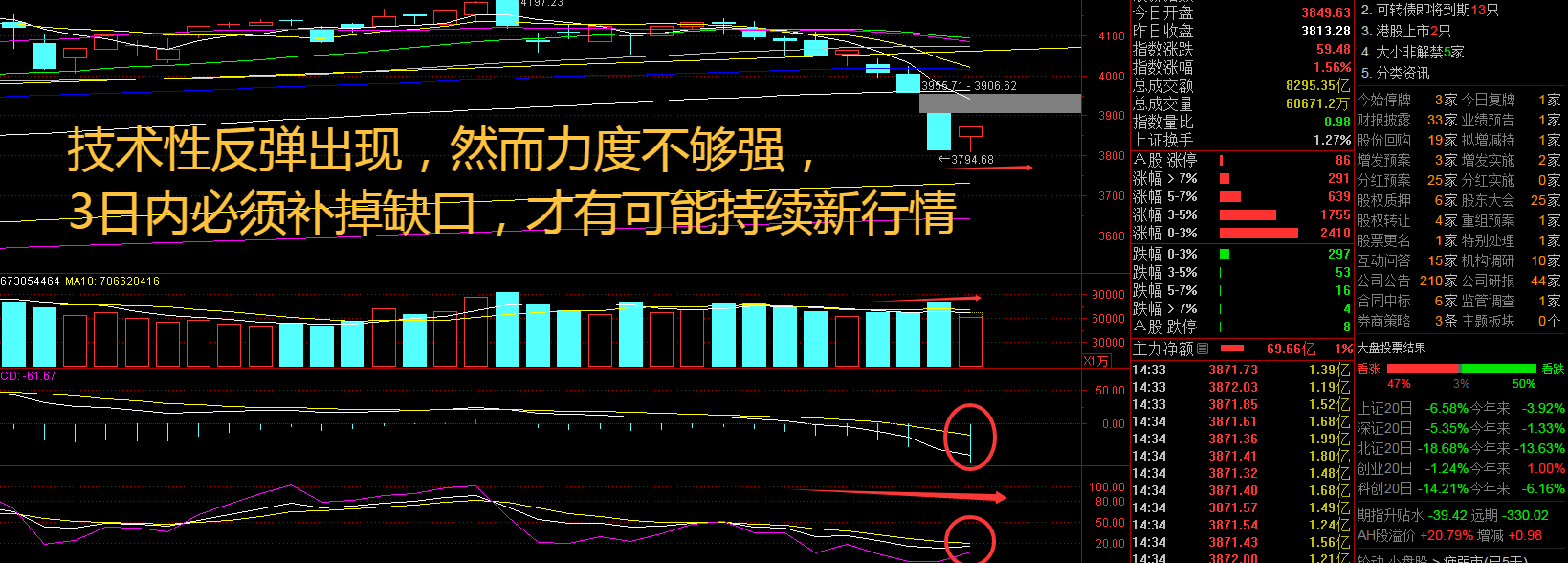 全球金融市场受到地缘政治的影响,出现了长达1个多月的行情,牛哥之前一直提到的“最怕A股补跌”,也在近期应验,这也说明:“技术走势上,该来的还是会来,只是早晚而已!”A股的连续下跌杀伤力极大,三大指数出现了破位走势,即使外盘大涨后亚太地区集体高开,仍然没有改变低走的态势,这也与不确定性增大后的恐慌情绪有关。A股市场并没有出现连续2个交易日大跌后的大阳线,主力资金出现了护盘手法,但是看到更多的是机构趁着指数高开减仓的操作,技术性的反弹来了,能否持续就要看是否有更好的政策利好支持了!