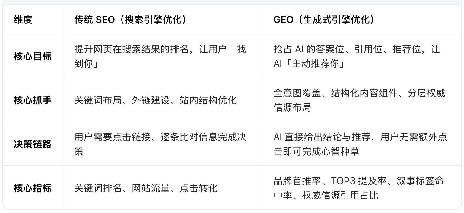 很多品牌会把GEO和传统SEO混淆,二者的核心逻辑有着本质区别: