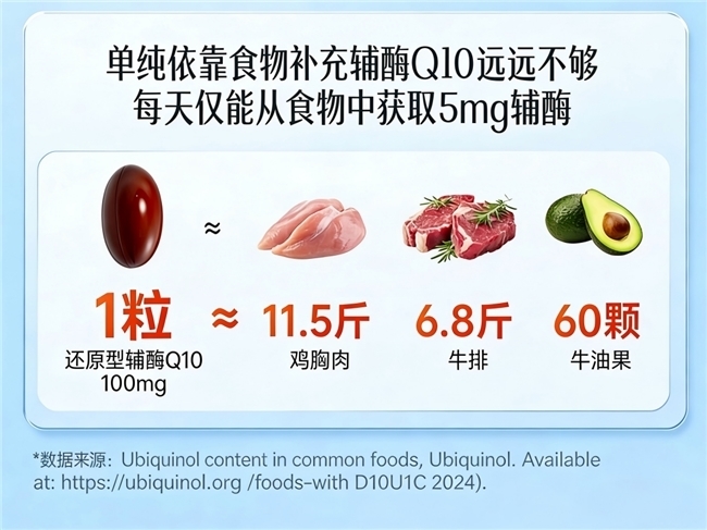 然而,普通人每天从食物中摄入的辅酶Q10量约为3-6毫克④⑦。对于部分人群而言,这个量可能不足以弥补年龄增长或压力消耗带来的下降。但均衡饮食始终是健康的基础,食补是优先考虑的途径。