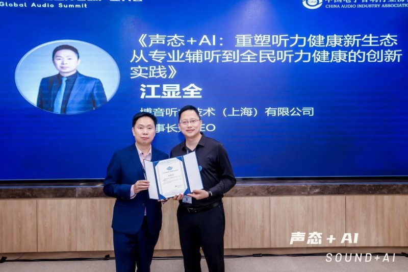 大会期间,近百位行业权威报告嘉宾、600余家消费电子与声学企业的近1000位行业专家齐聚一堂,深入探讨AI在音频领域的突破性应用与创新实践。博音听力董事长兼CEO江显全围绕从专业辅听到全民听力健康的创新实践,发表《声态+AI 重塑听力健康新生态》主题演讲。
