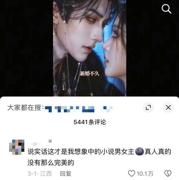 在某音上的AI短剧下,有一条10万+评论:“说实话这才是我想象中的小说男女主,真人真的没有那么完美的。”