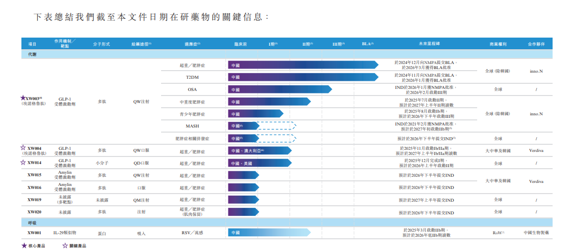 该药在中国内地于2026年1月获批用于治疗2型糖尿病以及于2026年3月获批用于治疗超重╱肥胖症。于2025年12月,公司与辉瑞订立商业化协议,据此授予辉瑞在中国内地商业化埃诺格鲁肽注射液(XW003)的独家权利。