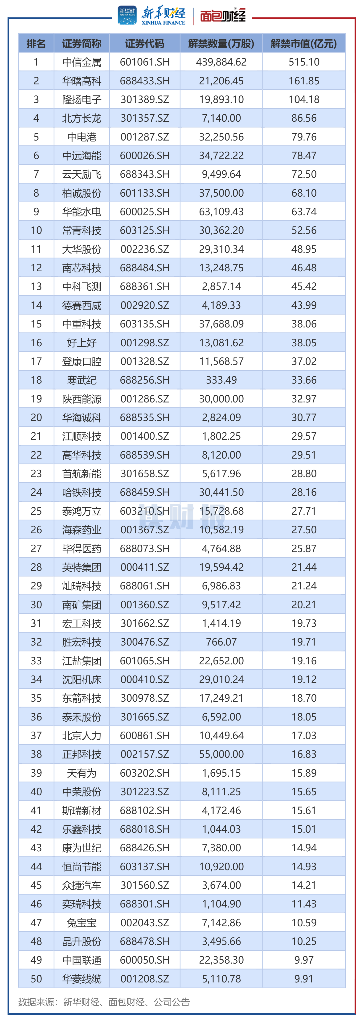 具体来看,中信金属、华曙高科、隆扬电子解禁规模位列前三。
