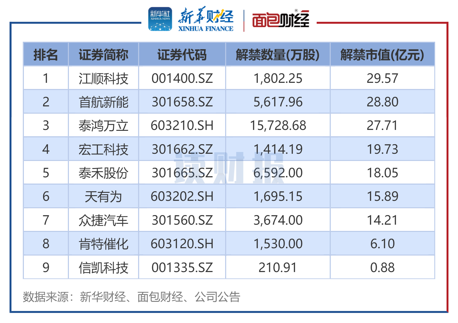 此外,共有9家公司、3.83亿限售股于4月迎上市周年解禁,解禁市值为160.95亿元,包括江顺科技、首航新能、泰鸿万立等企业。