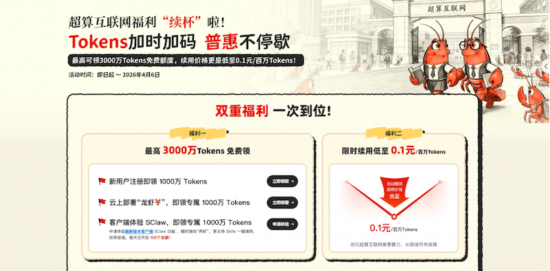 “自今年2月,超算互联网核心节点邀测计划上线以来,已吸引近4000位高校、科研院所、企业的用户申报参与,包括智谱、讯飞等国内一线大模型企业;本月养龙虾兴起后,超算互联网面向全体用户发放的免费词元(Token),都是依托的核心节点的超智融合算力”,曹振南介绍,为了让科研人员长期普惠的用智能体做创新,4月6日前,平台向每位用户免费发放最高3000万词元额度,且续用价格继续低至0.1元/百万词元。