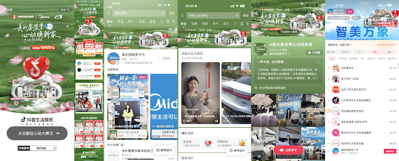 通过深度联动「抖音心动大牌日」IP,美的获得了开屏、主会场、直播间指示器等核心资源位的加持。在用户打开抖音的那一刻,就与“美的春装季”不期而遇,公域流量被精准触达、高效承接。