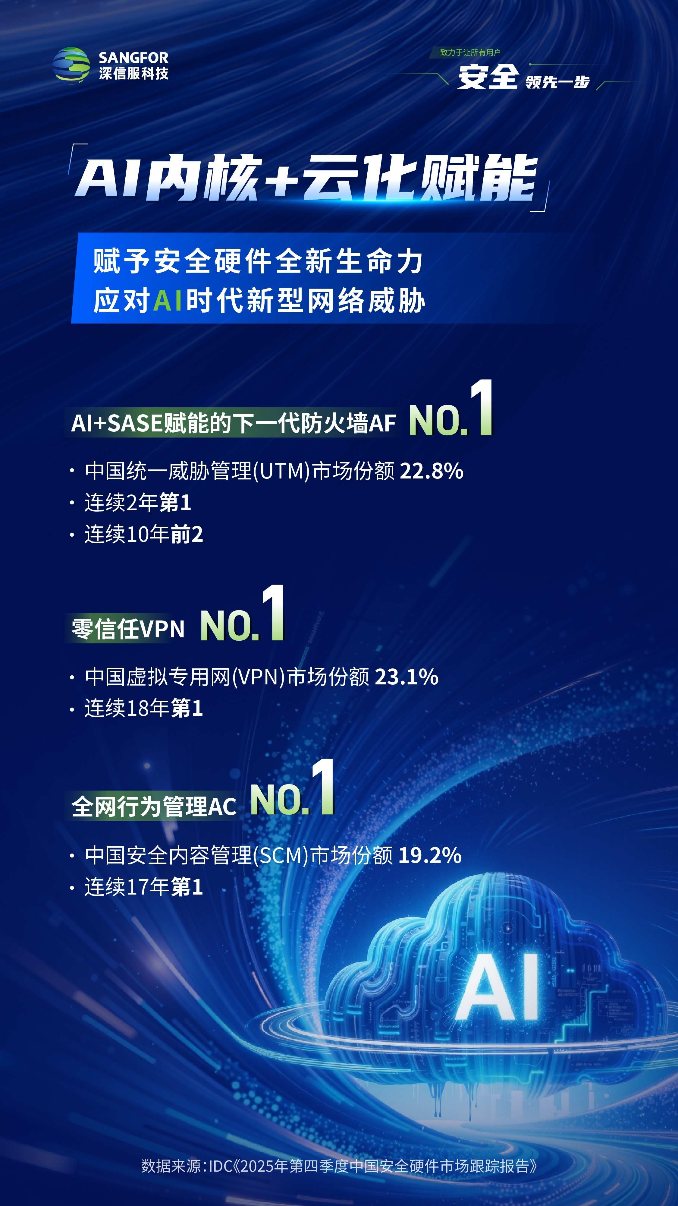 国际数据公司IDC最新发布的《2025年第四季度中国安全硬件市场跟踪报告》显示,深信服在网络安全硬件领域表现强劲,AI+SASE赋能的下一代防火墙AF、零信任VPN、全网行为管理AC分别以全年市场份额22.8%、23.1%和19.2%,稳居市场第一!