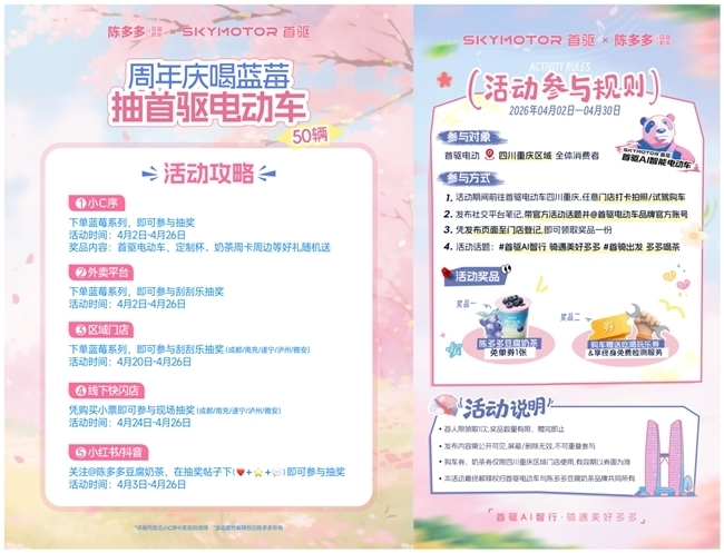 4月2日,AI 两轮智能出行新锐品牌首驱科技与豆腐奶茶品类引领者陈多多豆腐奶茶官宣达成跨界联名合作,共同推出“首骑出发・多多喝茶”主题系列活动,活动覆盖四川、重庆全域。双方以 “首驱 AI 智行・骑遇美好多多” 为主题,将智能出行的科技感与茶饮消费的烟火气深度融合,为年轻消费者打造“一杯奶茶,一路春风”的春日生活新场景,携手探索品牌联动的更多可能性。