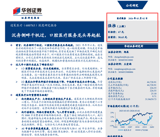 面包财经梳理公开资料发现,华创证券在3月2日晚间发布了关于通策医疗的深度研究报告。华创证券表示考虑到通策医疗近年来品牌力持续增强,并且正处在战略转型的关键阶段,未来业绩具备明确且较快的增长前景,将其评级由2025年11月的“**”上调至“强推”,目标价为67元。