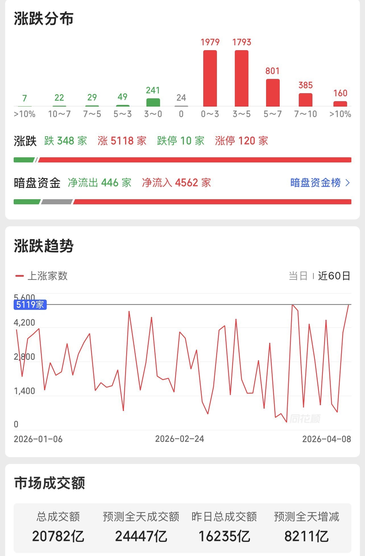 受到美以伊战事的“停战两周”事件影响,全球金融市场开启集体上涨模式,可谓是“苦秦久矣”,金融市场揭竿而起出现大涨走势带来一片回血迹象。A股市场也出现了久违的普涨行情,最夸张的是指数的大涨让人似乎感觉到“牛回头”了,接下来仍然要注意外围地缘政治的变化,毕竟“嘴强王者”早上和晚上说的话都是表里不一的,这个位置的进场资金主要还是试探性的短线资金,大资金仍然在等待最终的“靴子落地”。