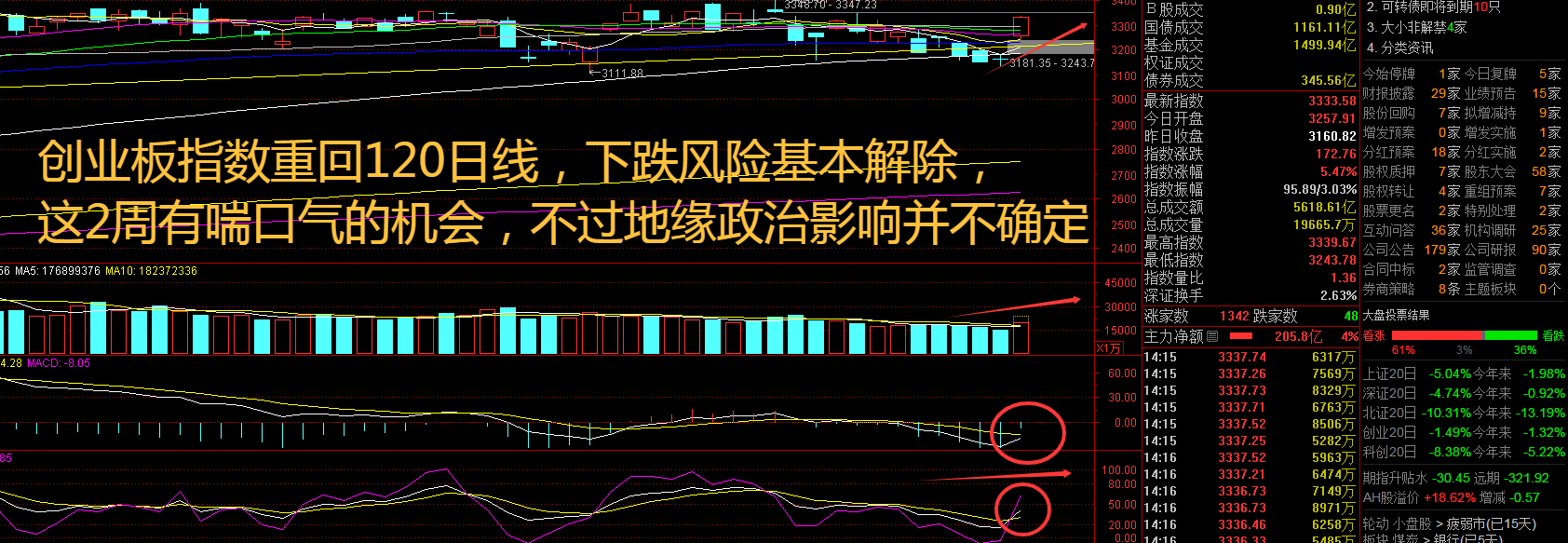 创业板指数周三大幅度走高,重回所有均线之上,这一态势也表明下跌风险转危为安,这里可以高看一线了。隔夜外围市场出现极度的反转行情,美股大幅反弹,美伊两国互相宣布胜利,特朗普表示接受停火两周的意见;伊朗媒体称,美国“被迫接受”其十点计划,伊朗与美国的谈判将于4月10日在巴基斯坦首都伊斯兰堡开始。接下来注意创业板指数能否在3310点之上稳住。