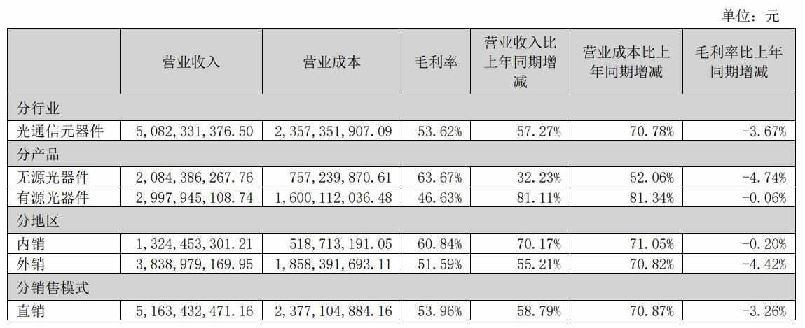 2025 年,天孚通信光通信元器件营收50.82 亿元,占总营收99.38%,同比增长57.27%;其中有源光器件营收29.98 亿元,同比大增81.11%,成为业绩核心增长引擎。公司毛利率维持53.96%高位,无源光器件毛利率63.67%,有源光器件毛利率46.63%,盈利能力远超行业平均水平。