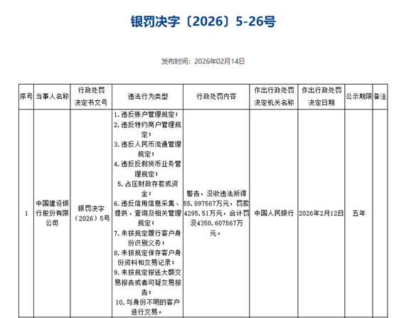 2026年2月14日,建设银行因违反账户管理规定、未按规定履行客户身份识别义务、未按规定报送大额交易报告或者可疑交易报告、与身份不明的客户进行交易等10项违法违规,被中国人民银行警告,没收违法所得55.097567万元,罚款4295.51万元,合计罚没4350.607567万元。