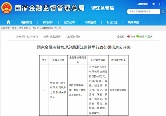 2026年2月6日,中信银行杭州分行由于贷款管理不审慎;票据业务管理不到位等,被浙江金融监管局罚款625万元,相关负责人邵炳斌、袁佳等14人被警告。