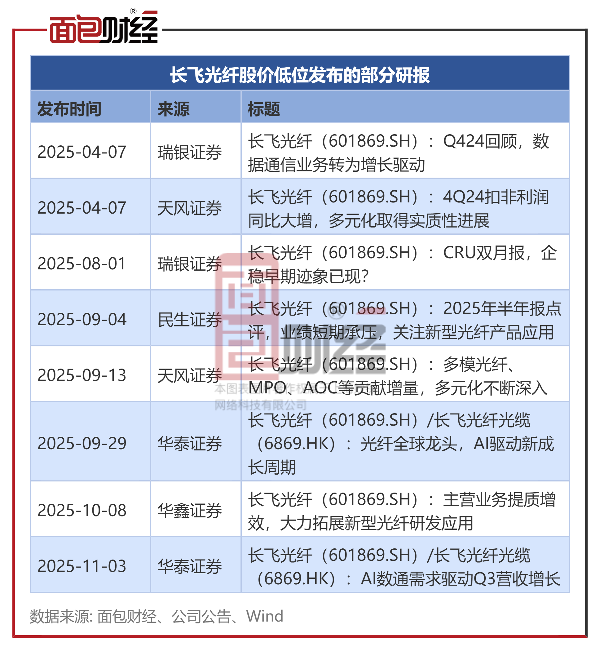 值得注意的是,根据不完全统计,长飞光纤2025年股价底部位置时,包括天风证券、华泰证券、瑞银证券、民生证券、华鑫证券在内的多家机构曾发布关于该股的看多研报。