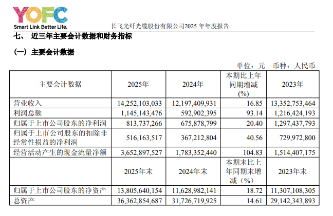 近日披露的2025年财报显示,长飞光纤2025年实现营收142.52亿元,同比上升16.85%;实现归母净利润8.14亿元,同比上升20.4%。