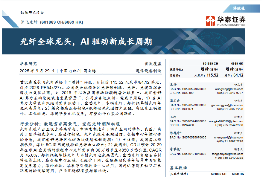 华泰证券分析师王兴、高名垚、王珂、陈越兮则在2025年9月发布研报《长飞光纤(601869):光纤全球龙头,AI驱动新成长周期》。研报首次覆盖长飞光纤并给予“增持”评级,目标价115.52人民币/64.12港元,对应2026 PE54x/27x。公司是全球领先的光纤预制棒、光纤、光缆及综合解决方案供应商,自2016年以来集团市场份额稳居全球第一。华泰证券看好AI算力基础设施快速发展背景下,公司业务迎来新一轮成长周期:1)在AI算力大带宽和低延时需求驱动下,空芯光纤、多模光纤、超低损单模光纤等迎来高景气;2)横向拓展业务领域+纵向做深光通信产业链,实现光互联组件、工业激光、海缆等多元化发展,有望向平台型公司跃迁。2025年11月,华泰证券再次发布长飞光纤研报。