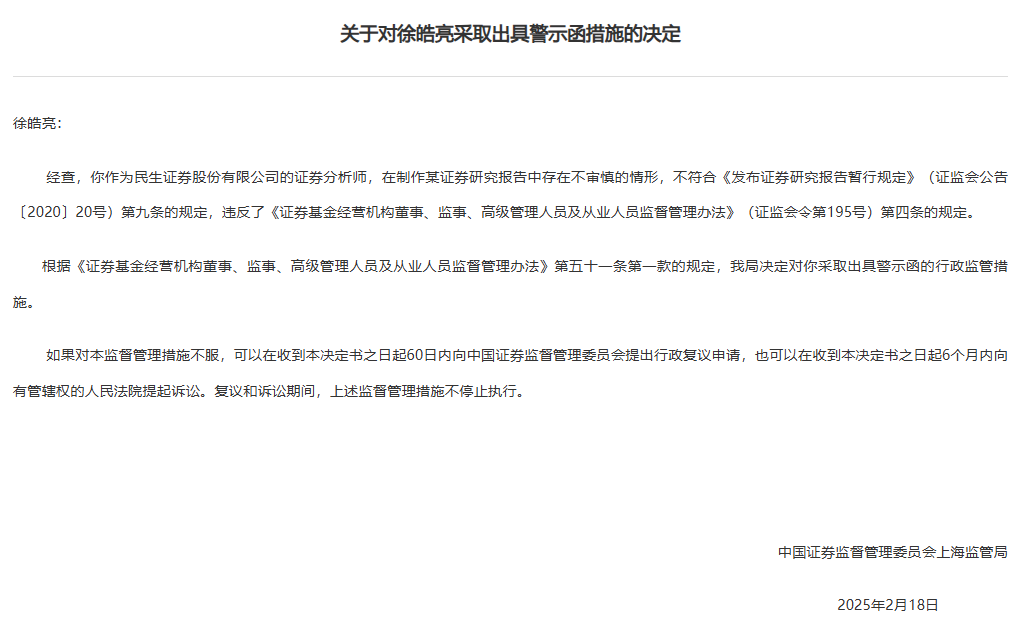 2025年2月,中国证券监督管理委员会上海监管局对徐皓亮采取出具警示函措施的决定。经查,徐皓亮作为民生证券股份有限公司的证券分析师,在制作某证券研究报告中存在不审慎的情形,不符合《发布证券研究报告暂行规定》(证监会公告〔2020〕20号)第九条的规定,违反了《证券基金经营机构董事、监事、高级管理人员及从业人员监督管理办法》(证监会令第195号)第四条的规定。