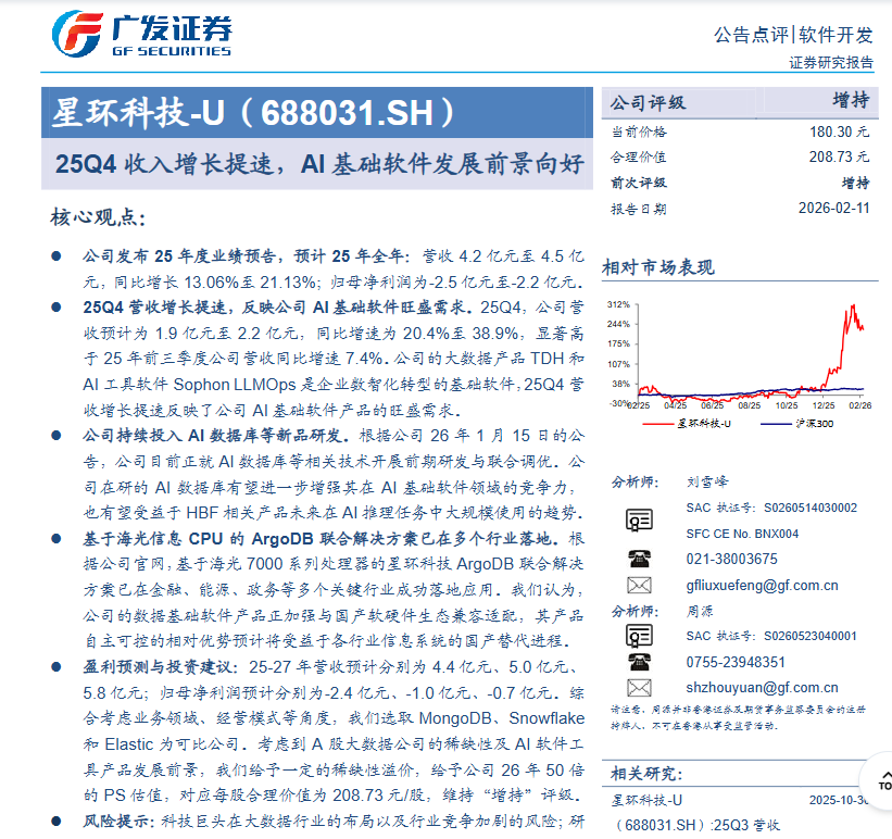 广发证券在2026年2月至3月期间发布多篇关于星环科技的研究报告。2月11日,广发证券发布研报《星环科技(688031):25Q4收入增长提速,AI基础软件发展前景向好》,给出盈利预测与投资建议:25-27年营收预计分别为4.4亿元、5.0亿元、5.8亿元;归母净利润预计分别为-2.4亿元、-1.0亿元、-0.7亿元。综合考虑业务领域、经营模式等角度,我们选取MongoDB、Snowflake和Elastic为可比公司。考虑到A股大数据公司的稀缺性及Al软件工具产品发展前景,我们给予一定的稀缺性溢价,给予公司2026年50倍的PS估值,对应每股合理价值为208.73元/股,维持“增持”评级。
