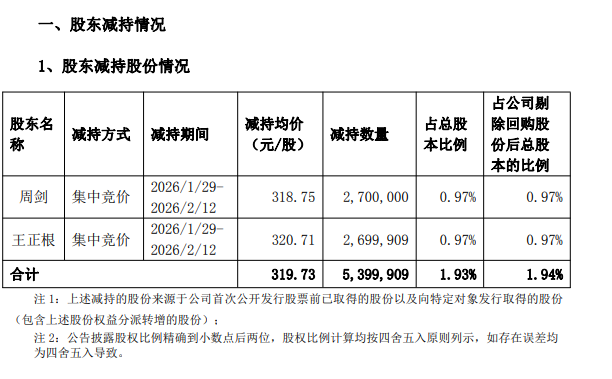 伴随股价强势上涨,迈为股份于2026年1月7日发布控股股东减持股份预披露公告。公告显示,合计持有迈为股份109,537,827 股的公司控股股东周剑及王正根计划以集中竞价或大宗交易的方式减持公司股份,减持数量不超过 5,400,000 股,即不超过公司当时总股本剔除回购专用账户中的股份数量后的1.94%。