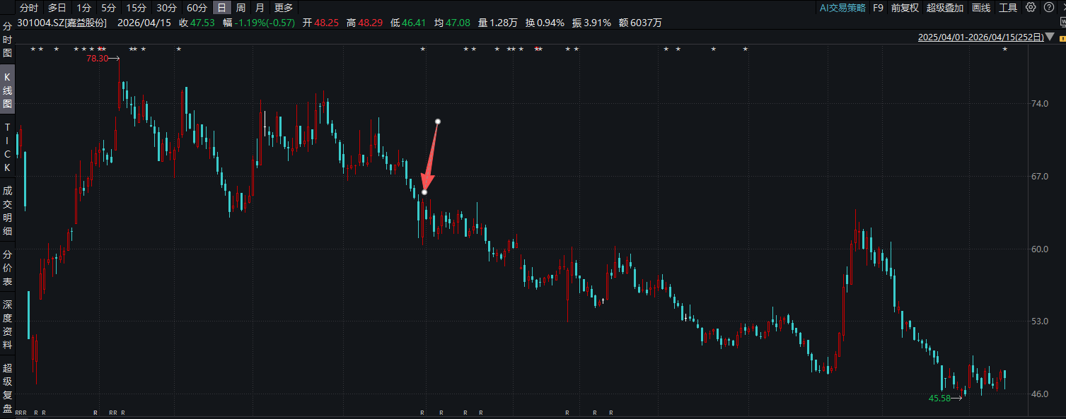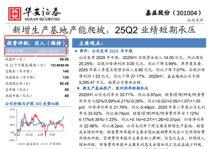 除此之外,嘉益股份股价自2025年4月月初低位震荡回升,在相对高位震荡横盘。嘉益股份高管马靖、朱中萍在5月合计减持公司股票15.75万股,公司股价在震荡过后开启持续下跌。截至目前,嘉益股份股价较研报披露时期跌幅超30%。