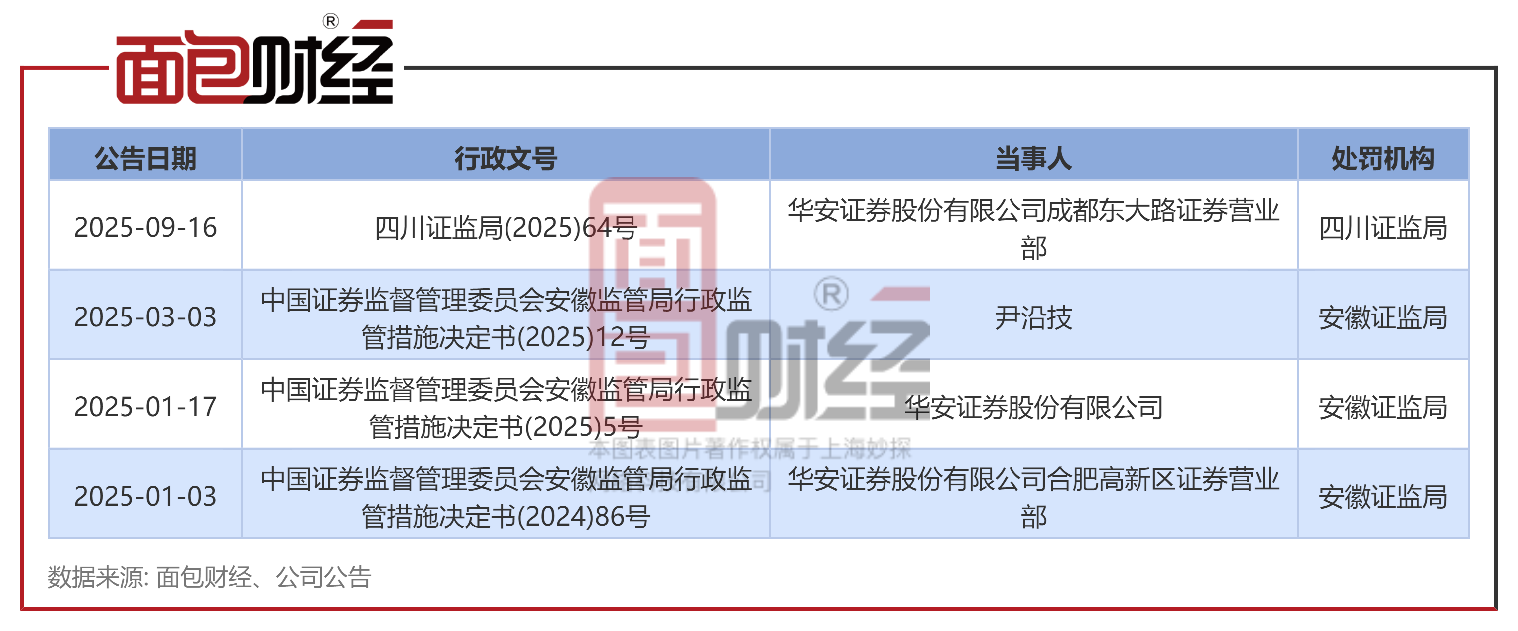 梳理公开信息可以发现,华安证券在2025年收到过多张罚单,其违规事项包括私募基金托管业务内控违规、员工管理合规不到位等。