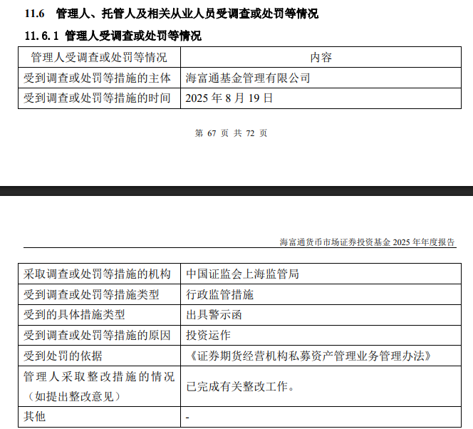 公告显示,海富通基金于2025年8月19日因投资运作被中国证监会上海监管局出具警示函,受到处罚的依据为《证券期货经营机构私募资产管理业务管理办法》。