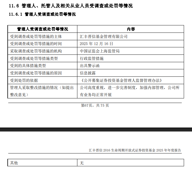2025年12月16日,汇丰晋信基金因信息披露原因被中国证监会上海监管局采取行政监管措施,被出具警示函。