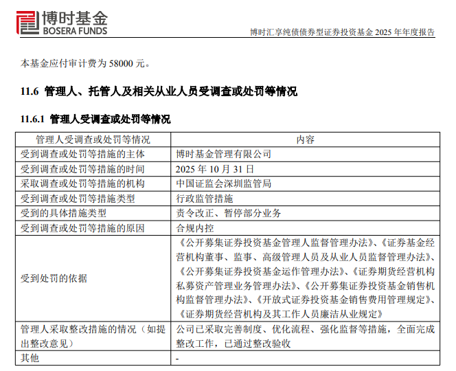 根据公告披露,博时基金于2025年10月31日因合规内控被中国证监会深圳监管局采取行政监管措施,要求公司责令改正、暂停部分业务。与此同时,博时基金两位高管也因合规内控问题被出具警示函。