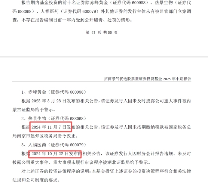 招商景气优选2025年中报显示,其重仓持有热景生物、人福医药两家上市公司,而这两家公司均存在合规问题,且违规事实早在2024年就已曝光。