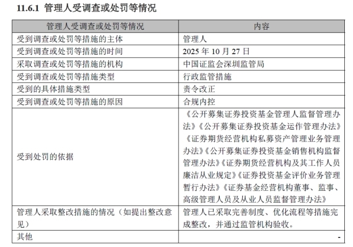据近期公告披露,2025年10月,因合规内控问题,招商基金被中国证监会深圳监管局采取责令改正行政监管措施,一名高管同步收到监管谈话。